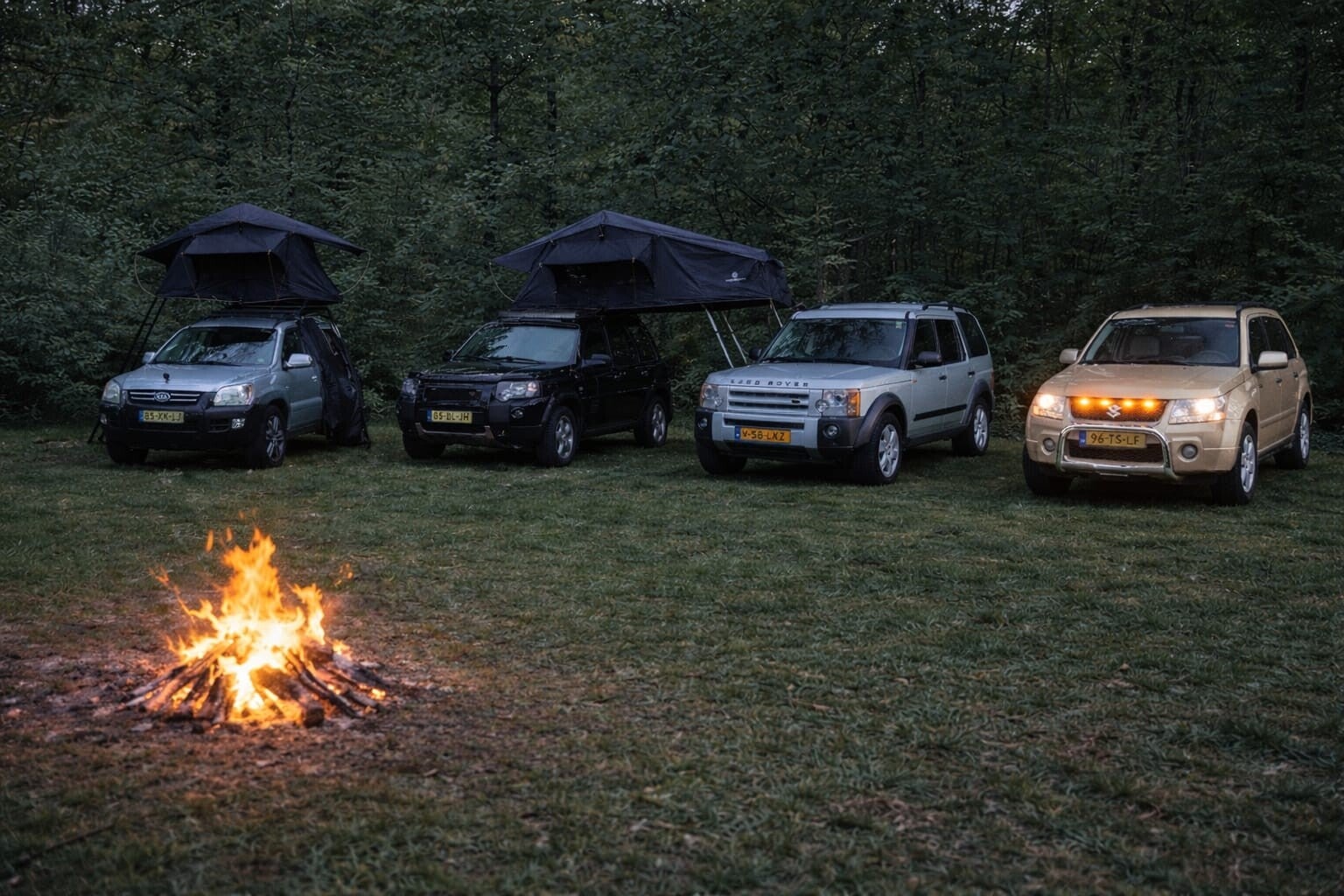 Twee gasten, daktenten, terreinwagens